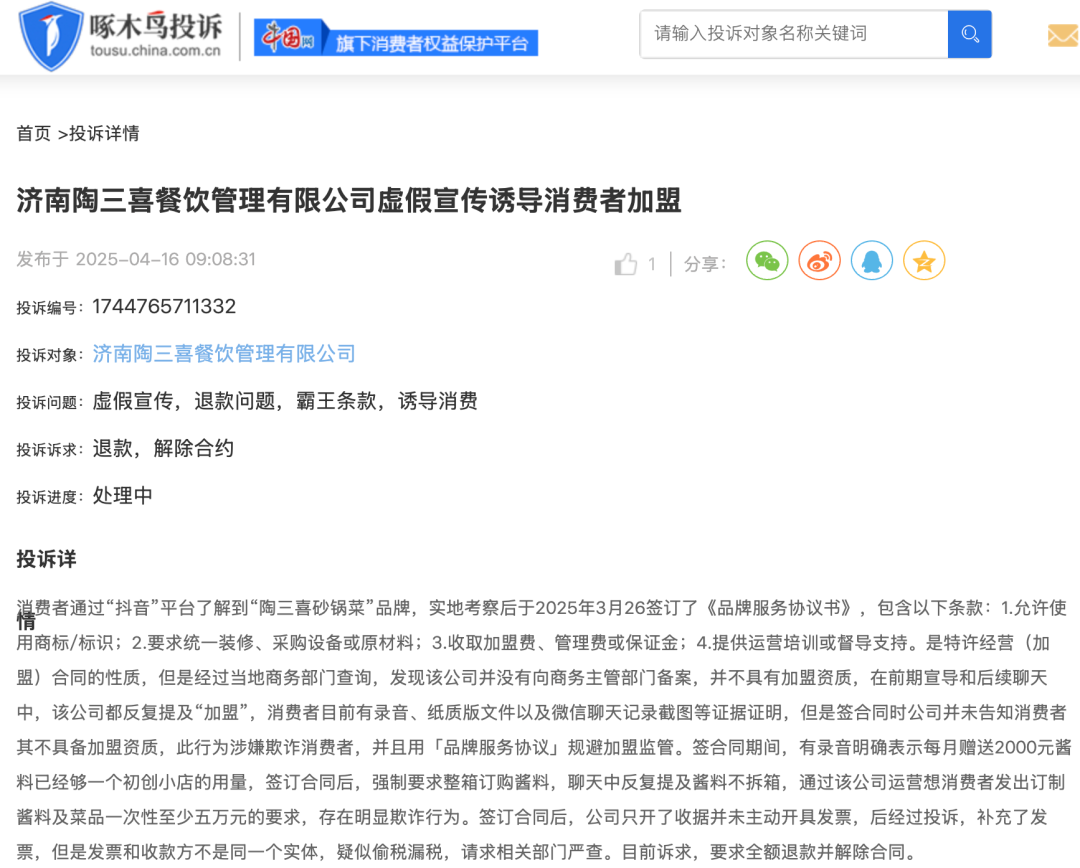 “啄木鸟投诉”平台上有关陶三喜餐饮管理有限公司的投诉内容。